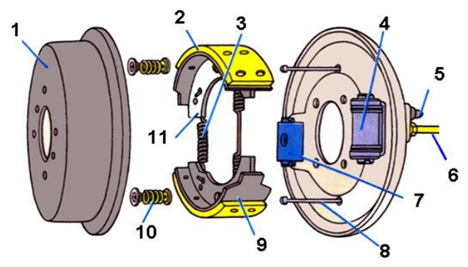 - Guốc phanh và má phanh được lắp trên mâm phanh nhờ hai chốt lệch tâm, lò xo hồi vị luôn kéo hai guốc phanh rời khỏi tang trống. Ngoài ra còn có các cam lệch tâm hoặc chốt điều chỉnh.